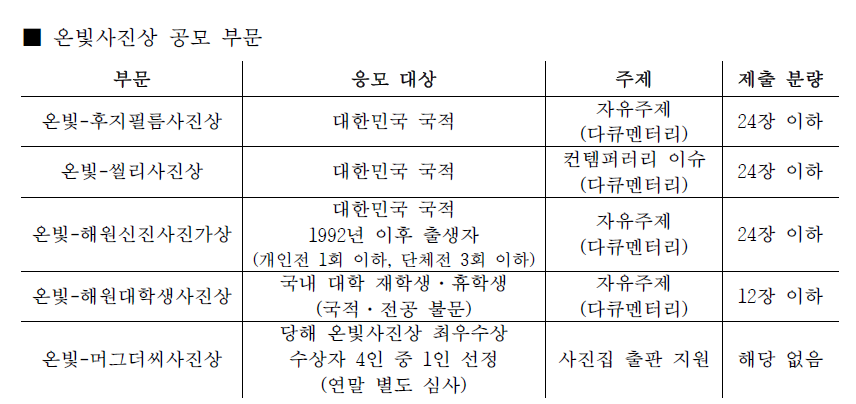 [°øÁö] Á¦15ȸ ¿Âºû»çÁø»ó 2026 °ø¸ð Á¦15ȸ ¿Âºû»çÁø»ó °ø¸ð ¡°¿Âºû´ÙÅ¥¸àÅ͸®¡±°¡ ¿´Ù¼¸ ¹øÂ° ¿Âºû»çÁø»ó °ø¸ð¸¦ ½ÃÀÛÇÕ´Ï´Ù. ¿Âºû´ÙÅ¥¸àÅ͸®(ȸÀå ±è¼º¹Î)´Â 2011³â »çÁø°¡µéÀÌ ¶æÀ» ¸ð¾Æ, »çÁøÀÇ º»ÁúÀÎ ±â·Ï¼ºÀ» ´Ù½Ã µ¹¾Æº¸°í À̸¦ ÅëÇØ µ¿½Ã´ë¸¦ ´õ¿í ±íÀÌ ÀÖ°Ô ÇØ¼®ÇϰíÀÚ ¼³¸³µÈ ´ÜüÀÔ´Ï´Ù. ÀÌÈÄ Çѱ¹ ´ÙÅ¥¸àÅ͸® »çÁø°èÀÇ È°¼ºÈ¸¦ À§ÇØ ²ÙÁØÈ÷ Ȱµ¿ÇØ¿À°í ÀÖ½À´Ï´Ù. ¿Âºû»çÁø»óÀº »çÁø°¡µéÀÇ Áö¼ÓÀûÀÎ ÀÛ¾÷À» °Ý·ÁÇϱâ À§ÇØ ¸¶·ÃµÇ¾ú½À´Ï´Ù. ¿ÃÇØ·Î 15ȸ¸¦ ¸Â¾ÒÀ¸¸ç Áö±Ý±îÁö ÃÑ 43ÀÎÀÇ ¼ö»óÀÚ¸¦ ¹èÃâÇß½À´Ï´Ù. ¼ö»óÀÚ¿¡°Ô´Â »ó±Ý ¼ö¿©, ÃÔ¿µ Àåºñ Á¦°ø, »çÁøÁý ÃâÆÇ, Àü±¹ ¼øÈ¸Àü Âü¿© µî ÀÛ¾÷ È®ÀåÀ» À§ÇÑ ´Ù¾çÇÑ ±âȸ¸¦ Á¦°øÇÕ´Ï´Ù. 2026³â ¿Âºû»çÁø»óÀº 3¿ù 20ÀϺÎÅÍ 4¿ù 5ÀϱîÁö Á¢¼ö¸¦ ÁøÇàÇÕ´Ï´Ù. ¿Â¶óÀÎ 1Â÷ ½É»ç¸¦ ÅëÇØ Èĺ¸ÀÚ 3ÀÎÀ» ¼±Á¤ÇÑ µÚ, 4¿ù 25ÀÏ °ø°³ ÇÁ·¹Á¨Å×À̼ǰú ÇöÀå ½É»ç¸¦ °ÅÃÄ ÃÖÁ¾ ¼ö»óÀÚ¸¦ °áÁ¤ÇÕ´Ï´Ù. ¶ÇÇÑ ¿ÃÇØ´Â Çѱ¹ ´ÙÅ¥¸àÅ͸® »çÁøÀÇ ¹Ì·¡¸¦ À̲ø ´ëÇлý »çÁø°¡¸¦ ¹ß±¼Çϱâ À§ÇØ ¡®¿Âºû-ÇØ¿ø´ëÇлý»ó¡¯À» ½Å¼³Çß½À´Ï´Ù. ±â¼ºÀÇ Æ²¿¡ ¸Ó¹«¸£Áö ¾Ê´Â Âü½ÅÇÑ ½Ã¼±°ú ½Ã´ëÀÇ °¨°¢À» ´ãÀº ÀÛ¾÷À» ±â´Ù¸³´Ï´Ù. ¿Âºû»çÁø»óÀº »çÁø°¡µéÀÇ È°µ¿À» ½ÇÁúÀûÀ¸·Î Áö¿øÇؿ ±¹³» À¯ÀÏÀÇ ´ÙÅ¥¸àÅ͸® »çÁø»óÀÔ´Ï´Ù. ¿ì¸®´Â ´ÙÅ¥¸àÅ͸® »çÁøÀÌ µ¿½Ã´ëÀÇ Çö½ÇÀ» ±â·ÏÇϰí ÇØ¼®ÇÏ´Â Áß¿äÇÑ ¾ð¾î¶ó°í ¹Ï½À´Ï´Ù. »çÁøÀ» ÅëÇØ ½Ã´ë¸¦ ÀÀ½ÃÇÏ´Â ÀÛ¾÷ÀÌ Áö¼ÓµÉ ¼ö ÀÖµµ·Ï ±× ¿©Á¤À» ÇÔ²² ÇϰڽÀ´Ï´Ù. ´ÙÅ¥¸àÅ͸®¸¦ »ç¶ûÇÏ´Â ¸¹Àº »çÁø°¡µéÀÇ Âü¿©¸¦ ±â´ëÇÕ´Ï´Ù. ![]() ¡Ø ¿Âºû-ÈÄÁöÇʸ§»çÁø»ó°ú ¿Âºû-¾Á¸®»çÁø»óÀº ÀÚµ¿ Áߺ¹ Áö¿ø ¡Ø ¿Âºû-JPÇÁ·ÎÁ§Æ®Áö¿ø»óÀº ¿ÃÇØ °ø¸ðÇÏÁö ¾ÊÀ½ ¡Ø »ý¼ºÇü AI·Î Á¦ÀÛÇÑ ÀÛǰÀº ½É»ç¿¡¼ Á¦¿Ü (¼ö»ó ÈÄ ¹ß°ß ½Ã Ãë¼Ò °¡´É) ¡Ø ÃÖ¿ì¼ö»ó ¼ö»óÀÚ Àü¿ø <2026 ¿Âºû»çÁø»ó Àü±¹ ¼øÈ¸Àü> Áö¿ø ¡Ø ¼ö»óÀÛ ÀúÀÛ±ÇÀº ÀÛ°¡¿¡°Ô ÀÖÀ¸¸ç ÁÖÃÖ ÃøÀº ºñ¿µ¸® È«º¸¡¤µµ·Ï Á¦ÀÛ ¸ñÀûÀ¸·Î »ç¿ë ![]() ◉ ¾È³» ¹× ÁÖÀÇ»çÇ× ¡Ø ¿Âºû-ÈÄÁöÇʸ§ »çÁø»ó°ú ¿Âºû-¾Á¸®»óÀº Áö¿øÀÚ´Â ÀÚµ¿Áߺ¹Áö¿ø µË´Ï´Ù. ¡Ø ¿Âºû-JPÇÁ·ÎÁ§Æ®»óÀº ¿ÃÇØ °ø¸ðÇÏÁö ¾Ê½À´Ï´Ù. ¡Ø º» »çÁø»ó¿¡ ÃâǰÇÏ´Â À̹ÌÁöÀÇ ÃÊ»ó±Ç ¹× ÀúÀ۱ǰú °ü·ÃÇÏ¿© ¹ß»ýÇÏ´Â ¸ðµç ¹ýÀû Ã¥ÀÓÀº ÃâǰÀÚ¿¡°Ô Àֱ⿡, »çÀü¿¡ ¹Ýµå½Ã ÃÊ»ó±Ç ¹× ÀúÀ۱ǿ¡ ´ëÇÑ È°¿ë µ¿ÀǸ¦ ¹ÞÀº ÈÄ ÀÀ¸ðÇØ¾ß ÇÕ´Ï´Ù. ¡Ø ¼ö»óÀÛÀÇ ÀúÀÛ±ÇÀº ÀÛ°¡¿¡°Ô ÀÖÀ¸¸ç ÁÖÃÖ ÃøÀº È«º¸ ¹× µµ·Ï Á¦ÀÛ µî ºñ¿µ¸® ¸ñÀûÀ¸·Î »ç¿ëÇÒ ¼ö ÀÖ½À´Ï´Ù. ¡Ø [»ý¼ºÇü AI ±ÝÁö] ´ÙÅ¥¸àÅ͸® »çÁøÀÇ º»ÁúÀ» Áö۱â À§ÇØ »ý¼ºÇü AI·Î Á¦ÀÛÇÑ ÀÛǰÀº ½É»ç¿¡¼ Á¦¿ÜµÇ¸ç, ¼ö»ó ÈÄ ¹ß°ß ½Ã Ãë¼ÒµÉ ¼ö ÀÖ½À´Ï´Ù. ◉ ¿Âºû»çÁø»ó Áö¿ø¼ ¹Þ±â (´Ù¿î·Îµå Ŭ¸¯) ◉ÀÀ¸ð¾È³» Á¢¼ö±â°£: 2026³â 3¿ù 20ÀÏ(±Ý) ~ 4¿ù 5ÀÏ(ÀÏ) ÀÚÁ¤(24½Ã)±îÁö Á¢¼ö¹æ¹ý: À̸ÞÀÏ Á¢¼ö(onbitdocu@gmail.com) Á¢¼ö¿ä°Ç: ÇÏ´ÜÀÇ ³»¿ëÀ» ²À ¼÷ÁöÇÏ¿© ÀÀ¸ðÇØÁÖ½Ã±æ ¹Ù¶ø´Ï´Ù. 1) ±ä º¯ 2400Çȼ¿, 300dpi, Jpeg/Jpg Çü½Ä(ÀÌ¿Ü ÆÄÀÏ Çü½Ä Á¢¼ö ºÒ°¡) 2) Æ÷Æ®Æú¸®¿À´Â 18Àå ÀÌ»ó 24Àå ÀÌÇÏ·Î ±¸¼º (¿Âºû-ÇØ¿ø´ëÇлý»çÁø»óÀº 8Àå~12Àå ÀÌÇÏ) 3) º» Áö¿ø¼¿Í Æ÷Æ®Æú¸®¿À¸¦ ¾ÐÃàÇÏ¿© ÇϳªÀÇ ¾ÐÃà Æú´õ·Î ÷ºÎ 4) ¸ÞÀÏ Á¦¸ñÀº <¿Âºû»çÁø»ó_ÈÄÁöÇʸ§-¾Á¸®, ½ÅÁø, ´ëÇлý Áß ÅÃÀÏ_À̸§>À¸·Î ¹ß¼Û ex) ¿Âºû»çÁø»ó_ÈÄÁöÇʸ§-¾Á¸®_È«±æµ¿ / ¿Âºû»çÁø»ó_½ÅÁø_¹Ú¹®¼ö ¿Âºû»çÁø»ó_´ëÇлý_À̼ø½Å 5) Æ÷Æ®Æú¸®¿ÀÀÇ »çÁø ÆÄÀÏ¸í¿¡´Â ÀÛ°¡¸í Ç¥±â ±ÝÁö ex) 01_¼¿ïdz°æ.jpg (O) 01_¼¿ïdz°æ_È«±æµ¿.jpg (X) ◉¹®ÀÇ »çÇ× ¹®ÀÇ ½Ã°£: 10:00 ~ 19:00 *¿øÈ°ÇÑ ¿î¿µÀ» À§ÇØ ¹®ÀÇ °¡´É ½Ã°£À» ÁؼöÇØ ÁÖ½Ã±æ ºÎŹµå¸³´Ï´Ù. ÀüÈ ¹®ÀÇ: 010-2790-1839 (¿Âºû ´ÙÅ¥¸àÅ͸®) *ºÎÀç ½Ã ¹®ÀÚ ¸Þ½ÃÁö¸¦ ³²°ÜÁֽøé È®ÀÎ ÈÄ ¿¬¶ôµå¸®°Ú½À´Ï´Ù. ¸ÞÀÏ ¹®ÀÇ: onbitdocu@gmail.com |