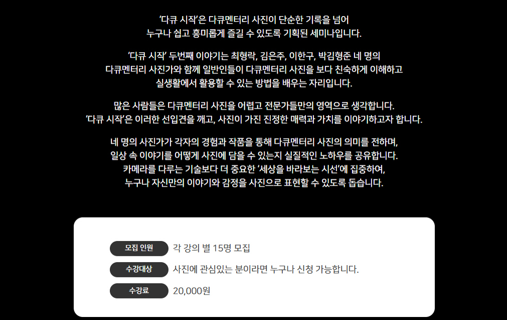 ³× ¸íÀÇ »çÁø°¡°¡ °¢ÀÚÀÇ °æÇè°ú ÀÛǰÀ» ÅëÇØ ´ÙÅ¥¸àÅ͸® »çÁøÀÇ Àǹ̸¦ ÀüÇϸç, ÀÏ»ó ¼Ó À̾߱⸦ ¾î¶»°Ô »çÁø¿¡ ´ãÀ» ¼ö ÀÖ´ÂÁö ½ÇÁúÀûÀÎ ³ëÇϿ츦 °øÀ¯ÇÕ´Ï´Ù. Ä«¸Þ¶ó¸¦ ´Ù·ç´Â ±â¼úº¸´Ù ´õ Áß¿äÇÑ ¡®¼¼»óÀ» ¹Ù¶óº¸´Â ½Ã¼±¡¯¿¡ ÁýÁßÇÏ¿©, ´©±¸³ª ÀڽŸ¸ÀÇ À̾߱â¿Í °¨Á¤À» »çÁøÀ¸·Î Ç¥ÇöÇÒ ¼ö ÀÖµµ·Ï µ½½À´Ï´Ù.